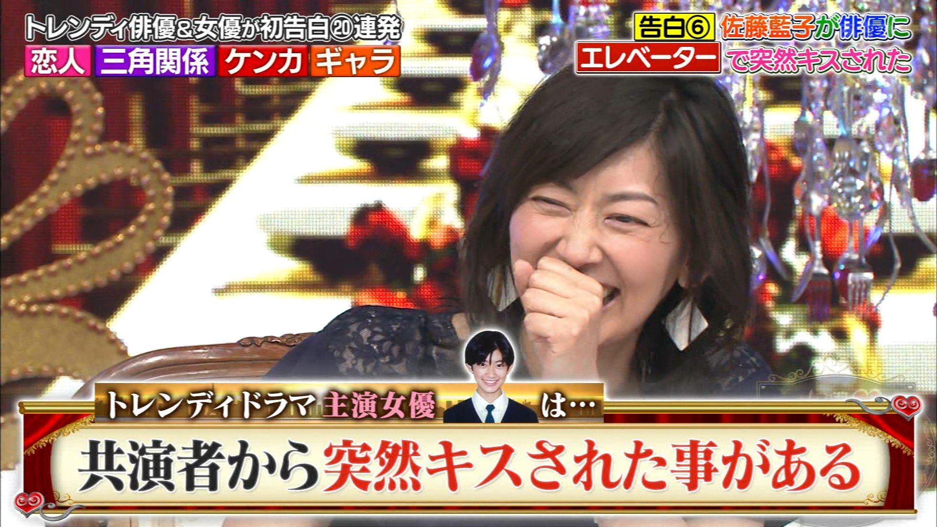 佐藤はこの日の番組で「初舞台で、アドバイスくれたり、助けてくれたお兄ちゃん的存在(だと思っていた)俳優さん」から、中打ち上げの時、一緒にエレベーターに乗ったら、突然「キスされた」と明かした。